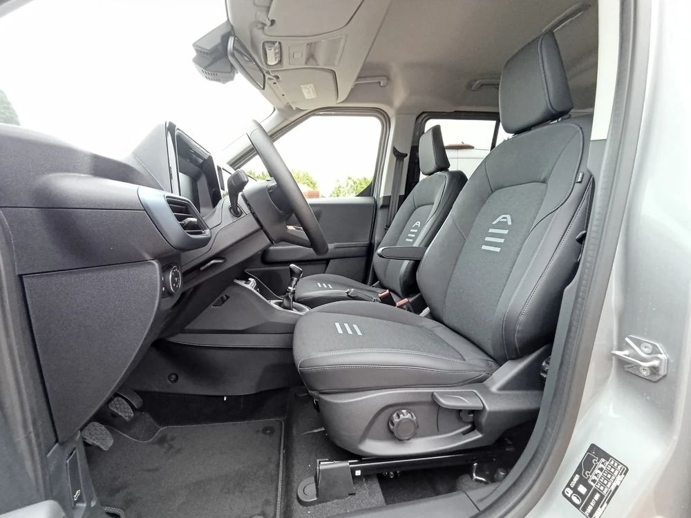 • Pakiet foteli przednich: układ 1+1; regulacja fotela kierowcy: przesuw przód/tył, pochylanie oparcia, regulacja wysokości, podłokietnik kierowcy, regulacja podparcia kręgosłupa; regulacja fotela pasażera: przesuw przód/tył, pochylanie oparcia